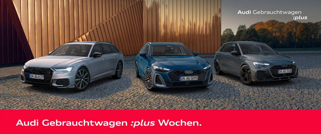Entdecken Sie jetzt ausgewählte, junge Audi Gebrauchtwagen* – top geprüft*, sofort verfügbar und zu besonders attraktiven Leasingkonditionen*. Noch bis zum 13. Oktober 2025* öffnet unsere Audi Gebrauchtwagenbörse die Bühne für sportliches Design und überragenden Fahrspaß: mit Audi A3, Audi A4, Audi A5, Audi A6 und Audi Q3. Erleben Sie Premium-Fahrzeuge, die bereit sind für ihre nächste große Performance! Zeit einzusteigen: Ihr Audi wartet – bei uns, Ihrem Audi Gebrauchtwagen :plus Partner.